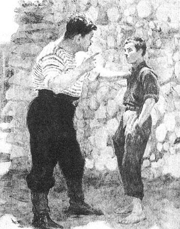 “你母亲告诉我,说你喜欢打架。她说你就像一只小公鸡那样好斗。”他笑起来,好像是满赞成似的。接着他又说:“打架倒不是坏事情,可是得知道该打谁和为什么打。”